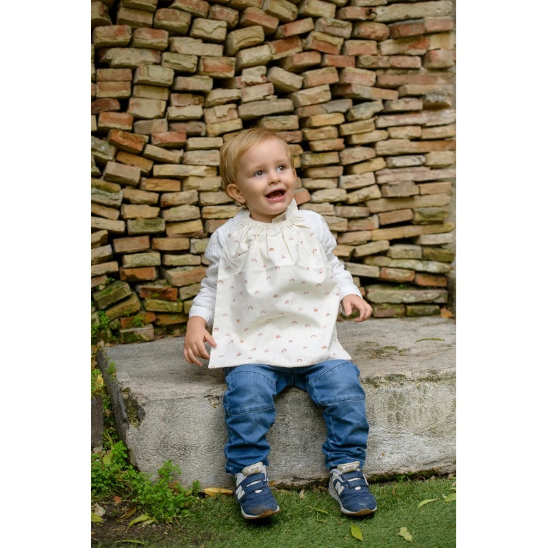 Le grand bavoir élastiqué BB&Co est en coton 100 %, certifié Oeko-Tex® et tellement irrésistible avec son superbe imprimé arc-en-ciel.