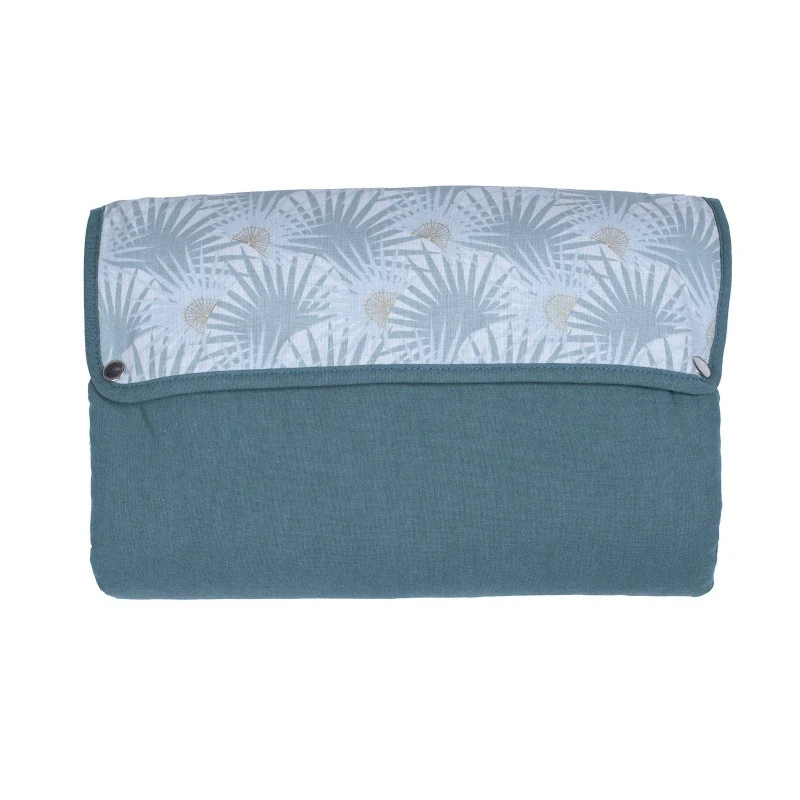 Le tapis à langer nomade BB&Co Palm Springs est composé d’une partie centrale en éponge verte céladon, où accueillir confortablement votre bébé, bordée de chaque côté d’un joli tissu imprimé de grandes feuilles de palmiers dans les mêmes tons. Ce tissu à motifs dispose de pochettes pour y transporter couches ou lingettes.