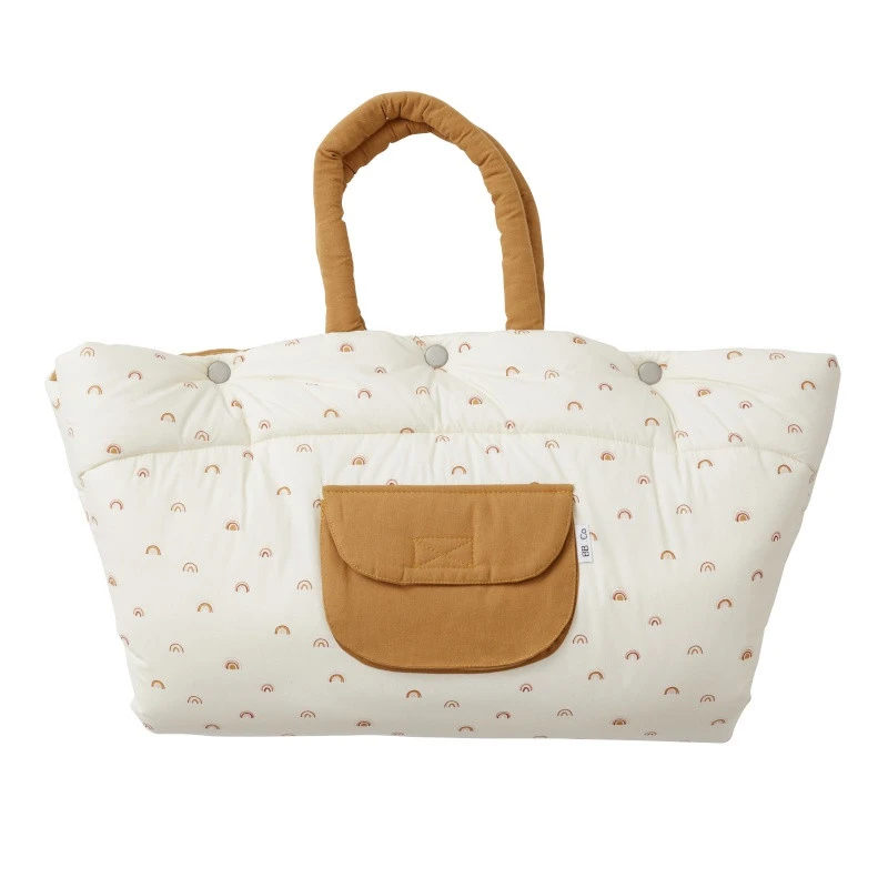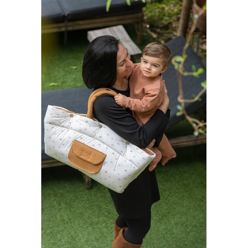 La face intérieure du tapis de jeu nomade BB&Co, sur laquelle vous installez votre petit, est réalisée en tissu Minky tout doux. L’extérieur est quant à lui fabriqué dans un joli coton imprimé de petits arc-en-ciel, enduit pour être imperméable et isolant. A noter, la poche et les poignées de transport, dans un moutarde contrasté pour rehausser les couleurs pastels et donner à l’ensemble beaucoup d’élégance.